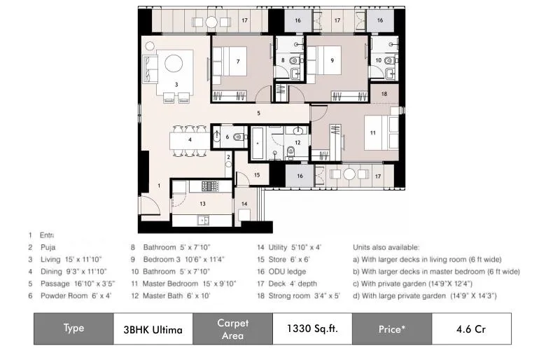 | 3 Bhk Ultima | 1330 Sq. ft.(Carpet Area) | 5.6 Cr* All Inc. |
